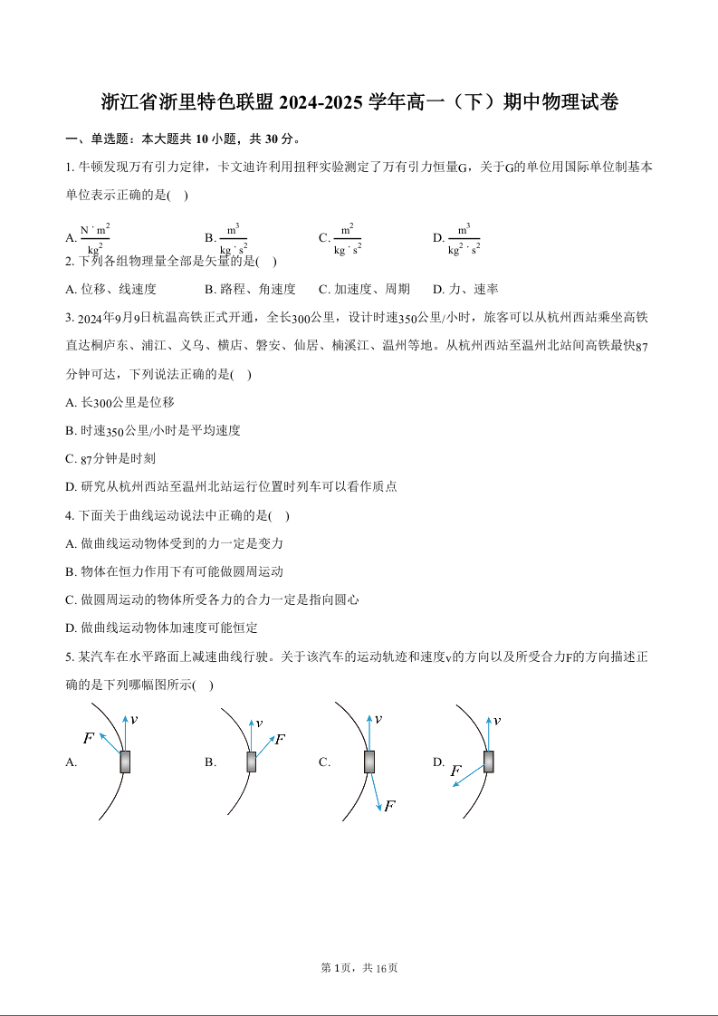 浙江省浙里特色联盟2024-2025学年高一下学期4月期中联考物理+答案