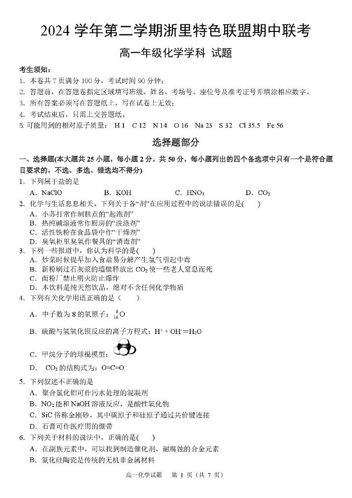 浙江省浙里特色联盟2024-2025学年高一下学期4月期中联考化学+答案
