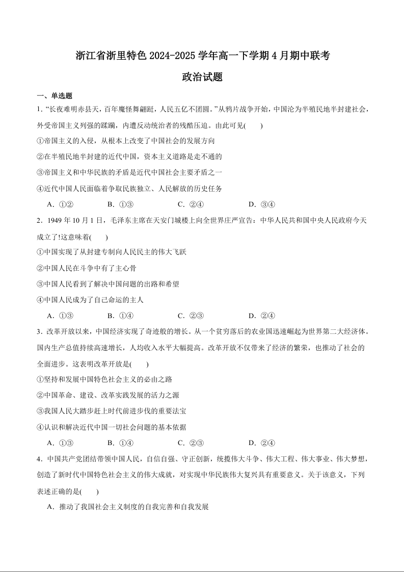浙江省浙里特色联盟2024-2025学年高一下学期4月期中联考政治+答案
