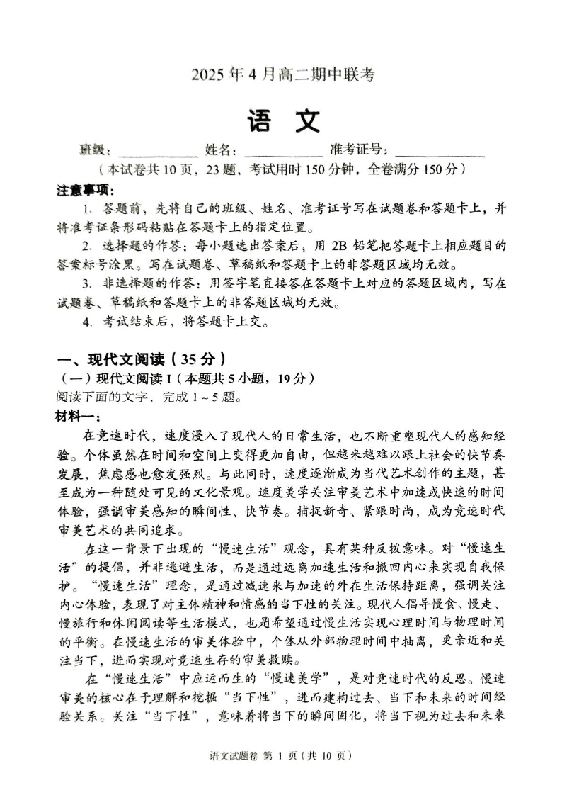 湖南省三新协作体2024-2025学年下学期4月高二期中联考语文