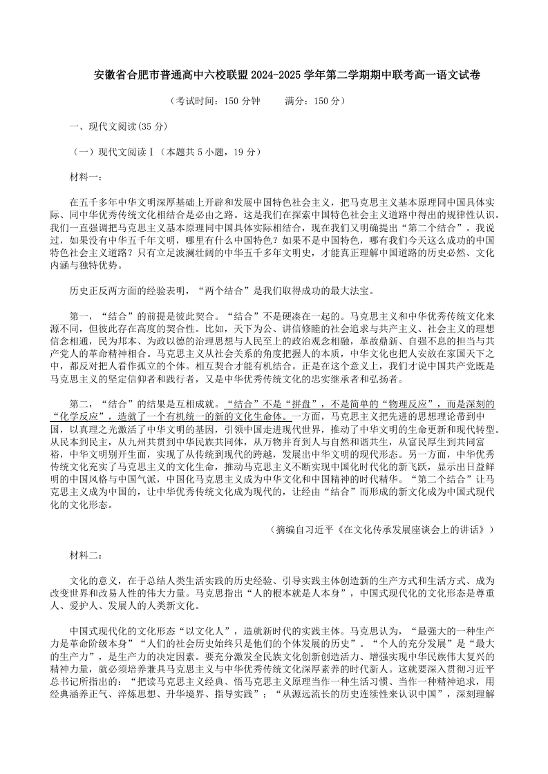 安徽省合肥市六校联盟2024-2025学年下学期4月高一期中考试语文+答案