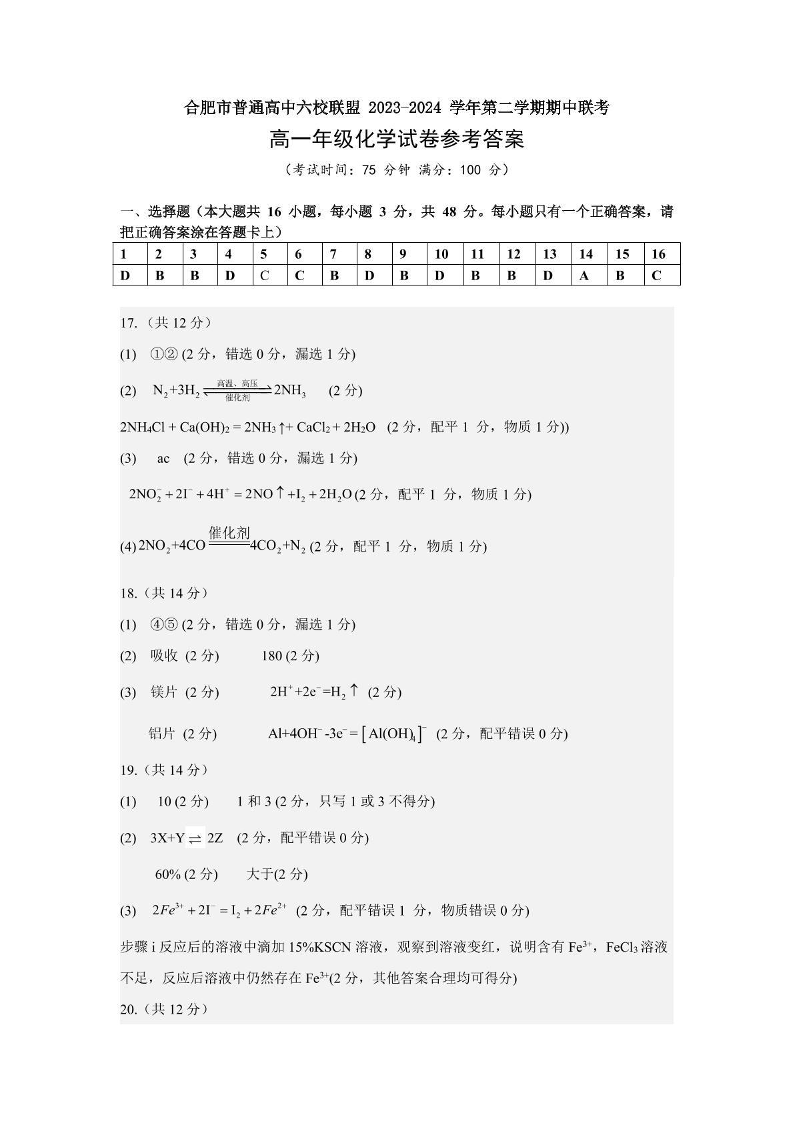 安徽省合肥市六校联盟2024-2025学年下学期4月高一期中考试化学答案