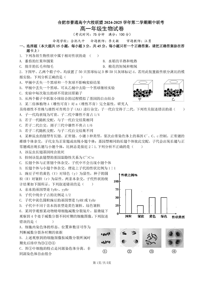 安徽省合肥市六校联盟2024-2025学年下学期4月高一期中考试生物+答案