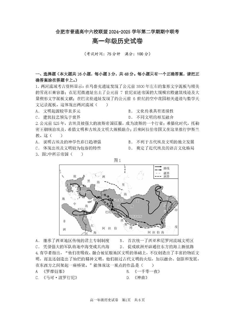 安徽省合肥市六校联盟2024-2025学年下学期4月高一期中考试历史+答案