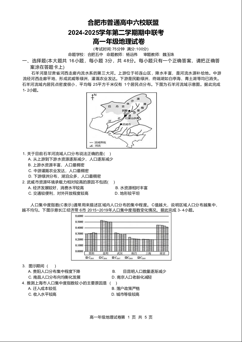 安徽省合肥市六校联盟2024-2025学年下学期4月高一期中考试地理+答案