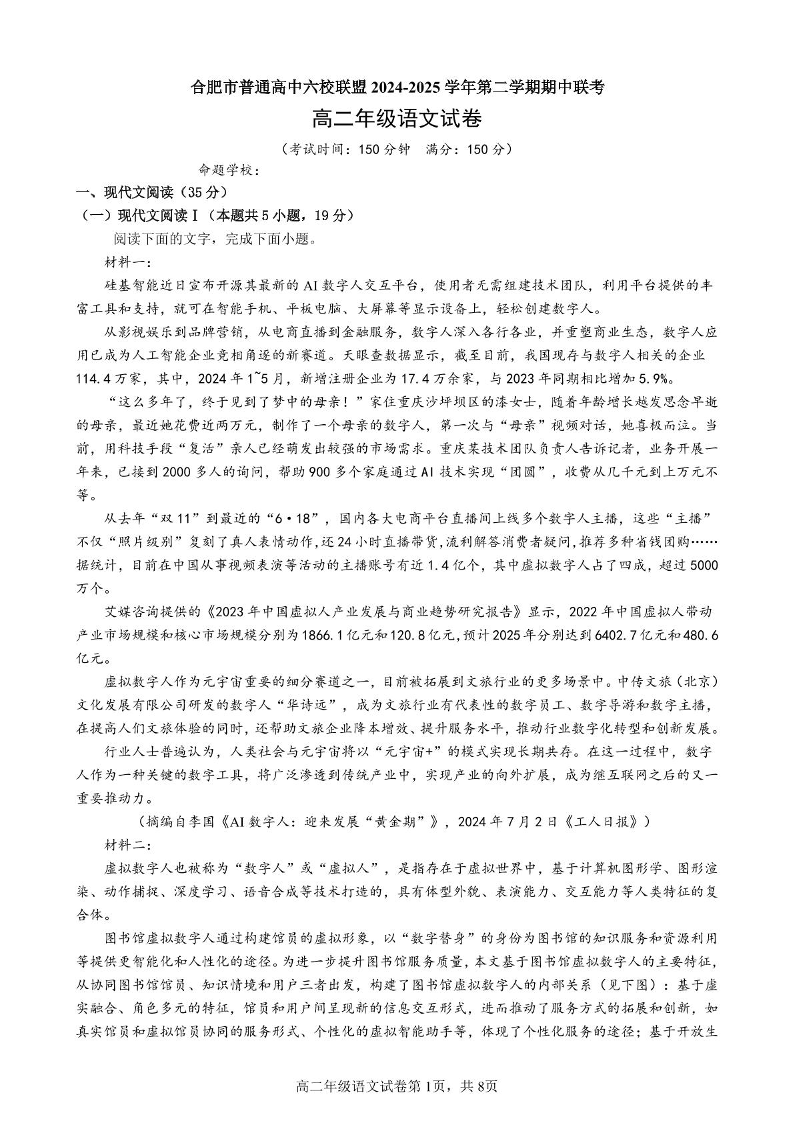 安徽省合肥市六校联盟2024-2025学年下学期4月高二期中考试语文+答案