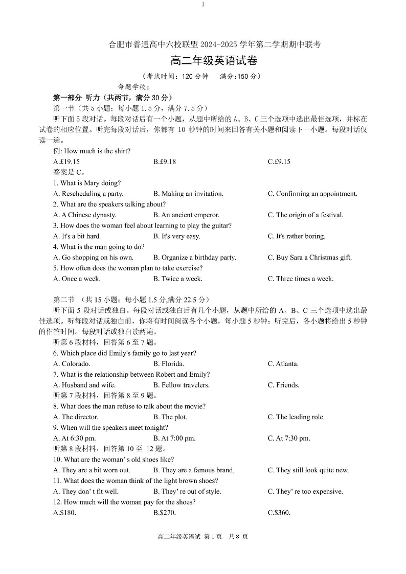 安徽省合肥市六校联盟2024-2025学年下学期4月高二期中考试英语+答案