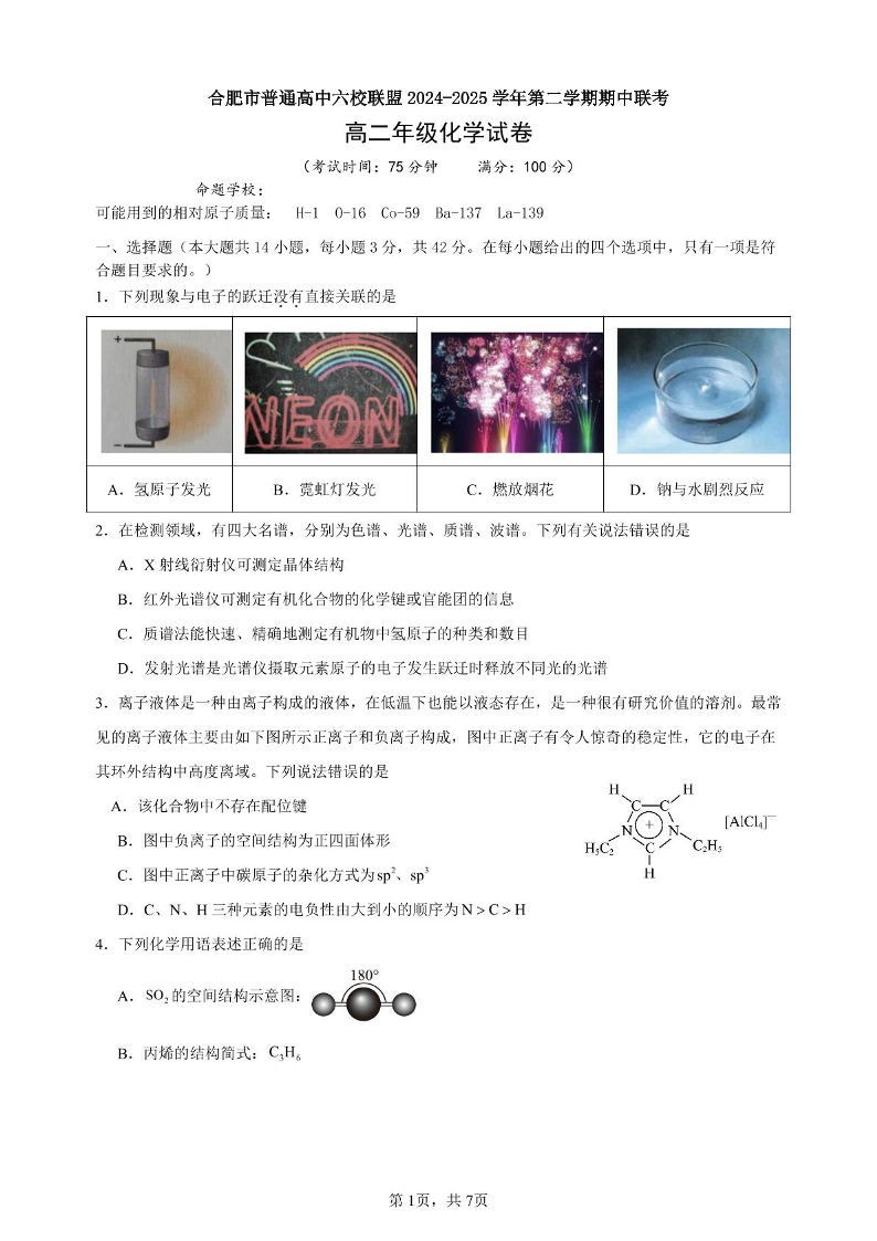 安徽省合肥市六校联盟2024-2025学年下学期4月高二期中考试化学+答案
