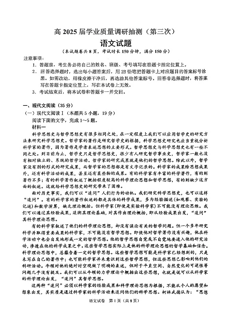 重庆市高2025届高三学业质量调研抽测(三诊)语文