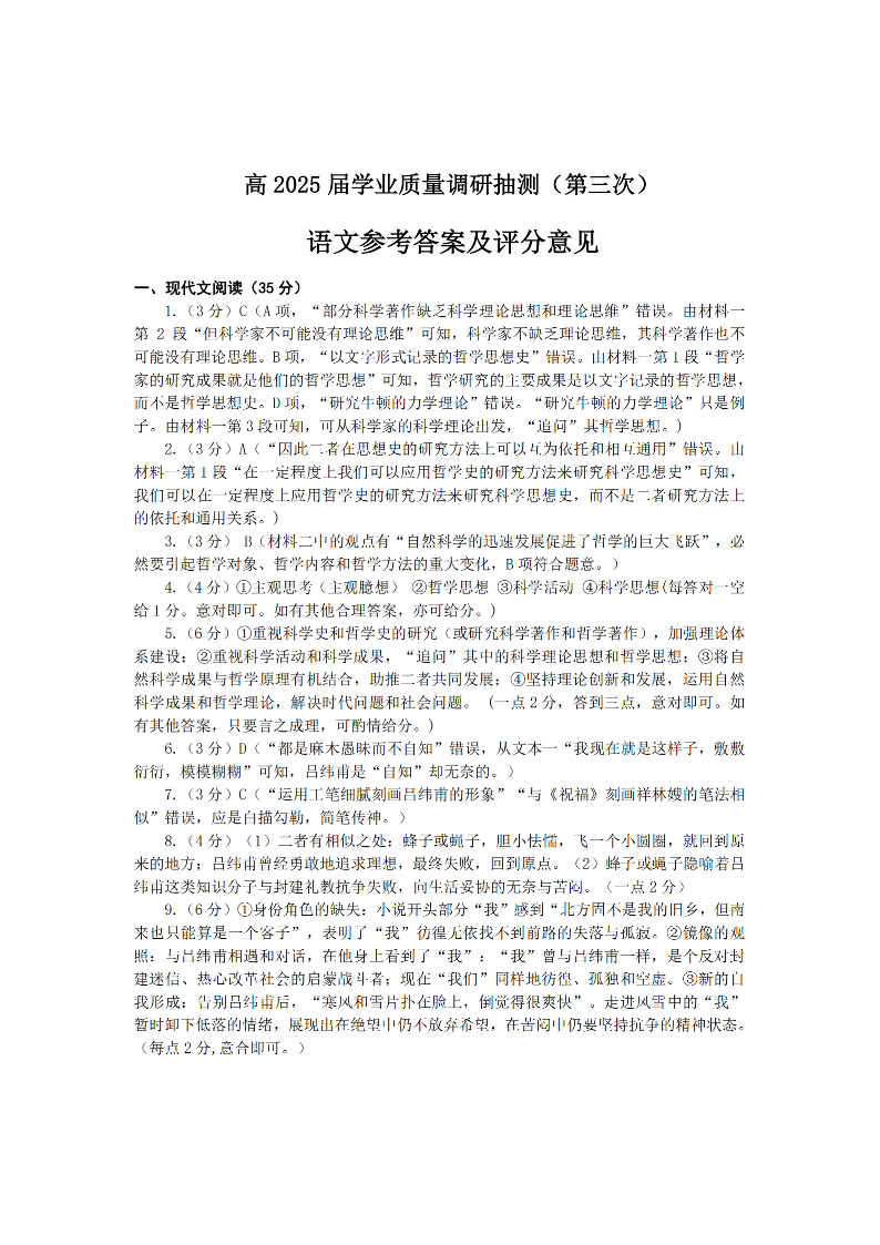 重庆市高2025届高三学业质量调研抽测(三诊)语文答案