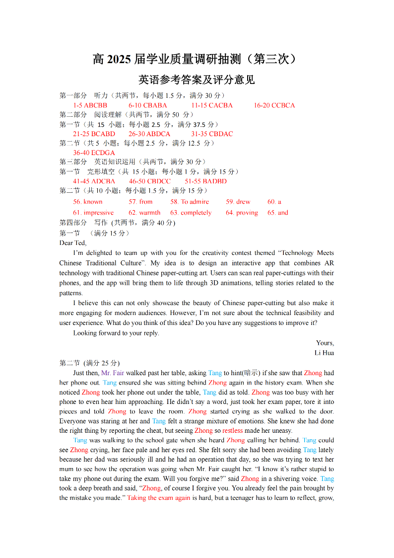 重庆市高2025届高三学业质量调研抽测(三诊)英语答案