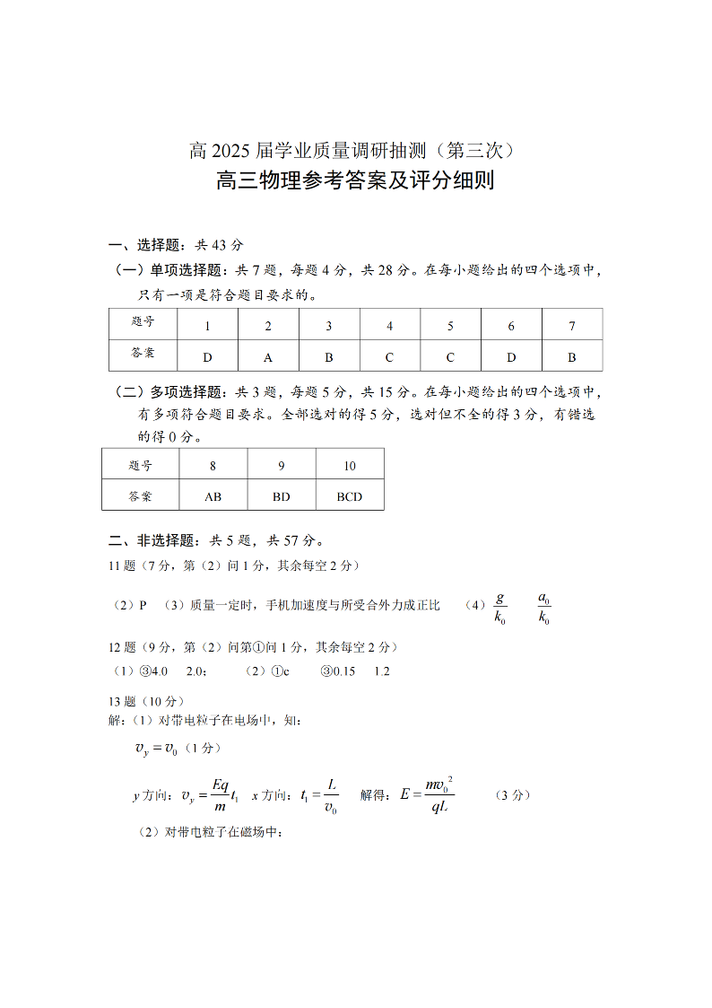 重庆市高2025届高三学业质量调研抽测(三诊)物理答案