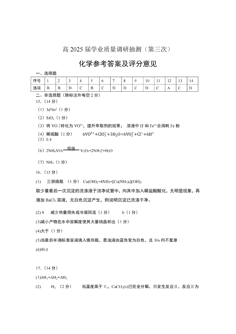 重庆市高2025届高三学业质量调研抽测(三诊)化学答案