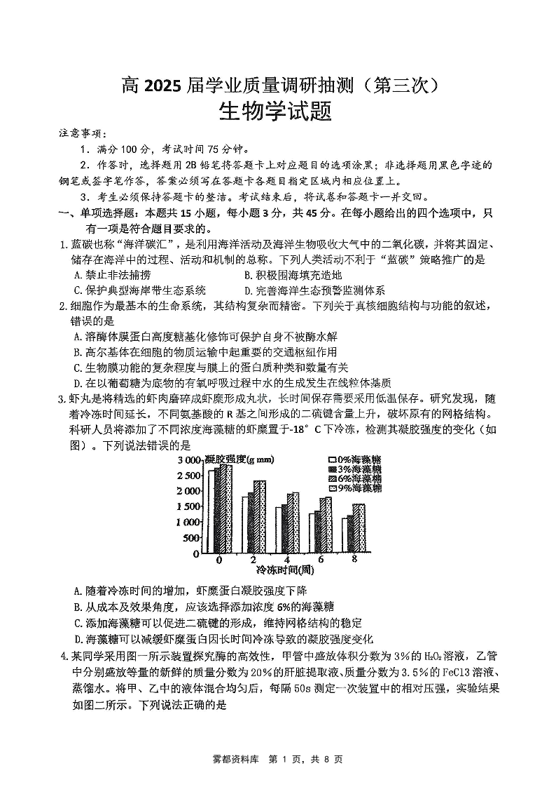 重庆市高2025届高三学业质量调研抽测(三诊)生物