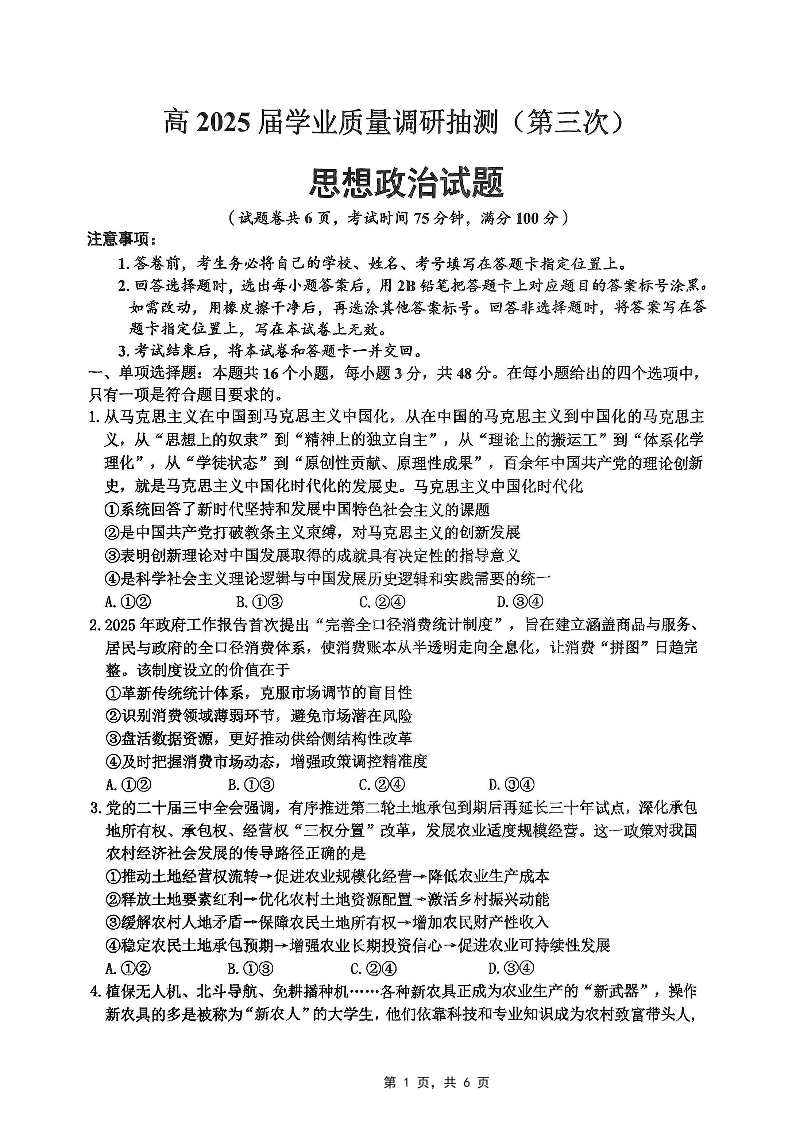 重庆市高2025届高三学业质量调研抽测(三诊)政治