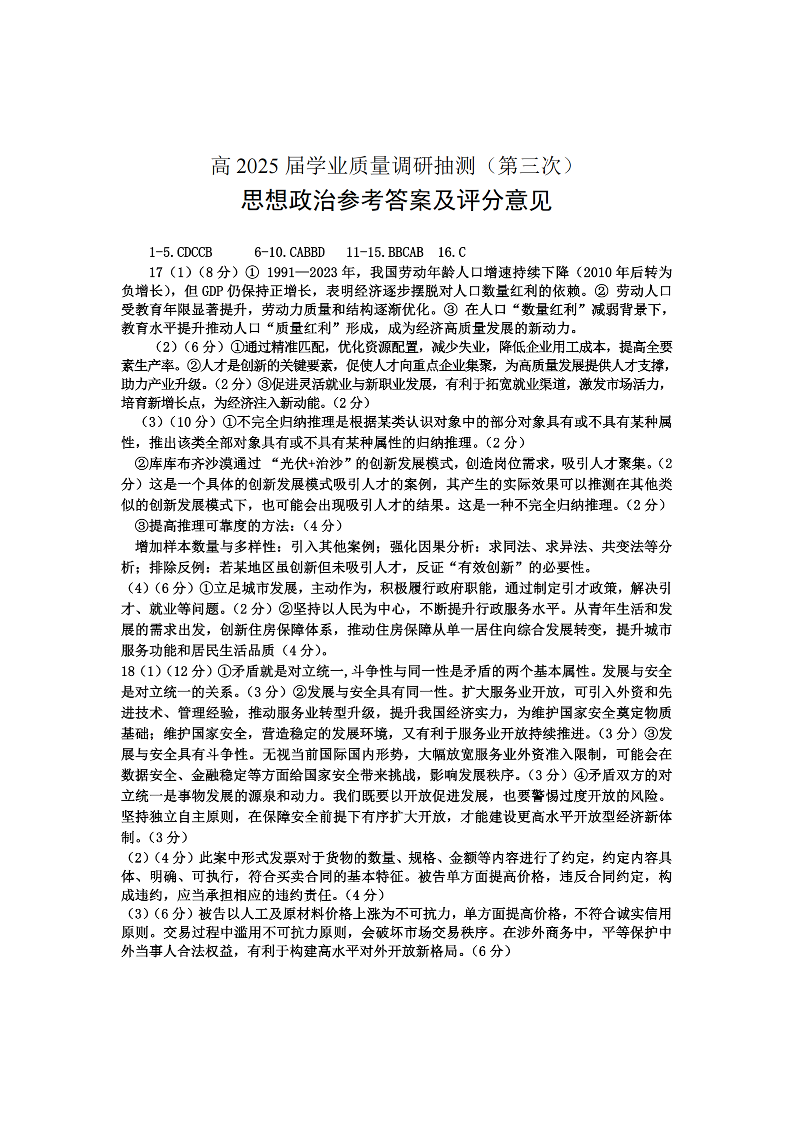 重庆市高2025届高三学业质量调研抽测(三诊)政治答案