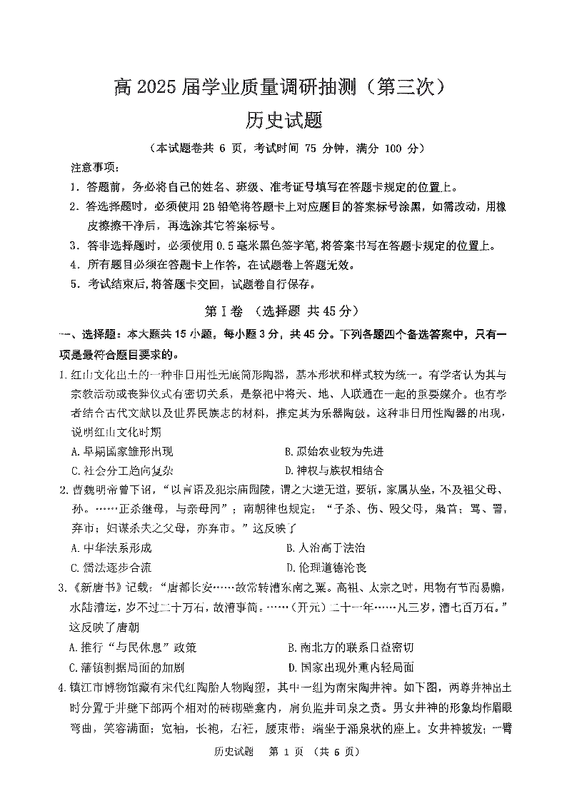 重庆市高2025届高三学业质量调研抽测(三诊)历史