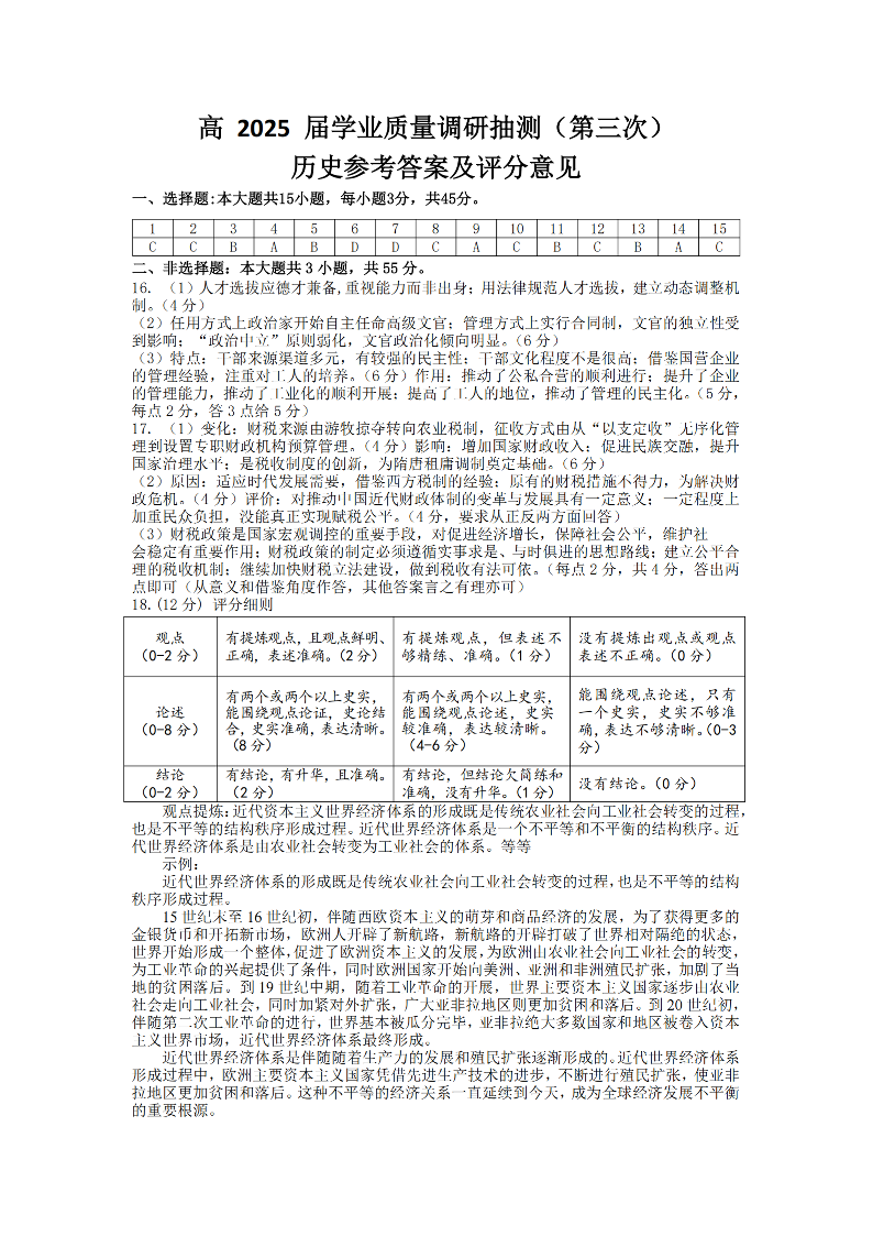 重庆市高2025届高三学业质量调研抽测(三诊)历史答案