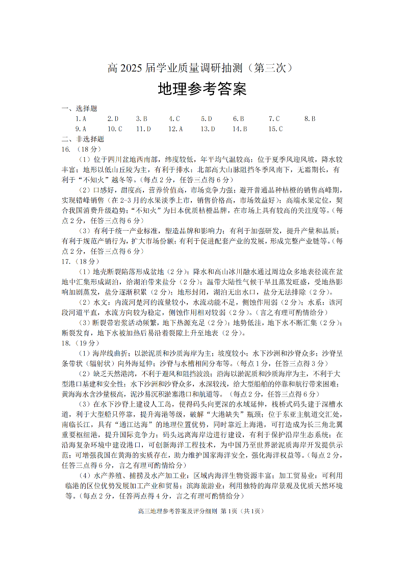 重庆市高2025届高三学业质量调研抽测(三诊)地理答案