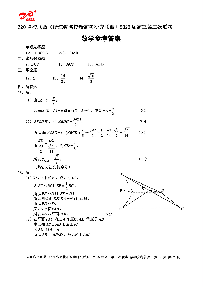 浙江省Z20联盟2025届高三第三次联考数学答案