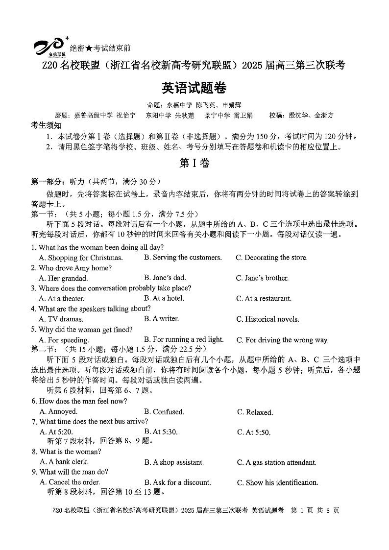 浙江省Z20联盟2025届高三第三次联考英语