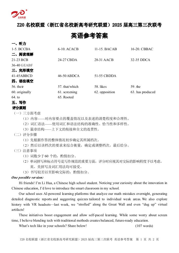 浙江省Z20联盟2025届高三第三次联考英语答案