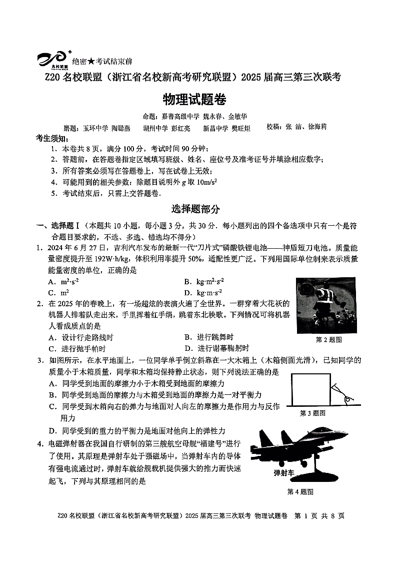 浙江省Z20联盟2025届高三第三次联考物理