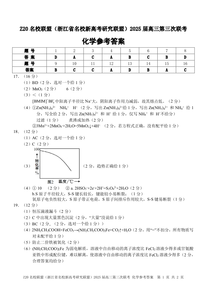 浙江省Z20联盟2025届高三第三次联考化学答案