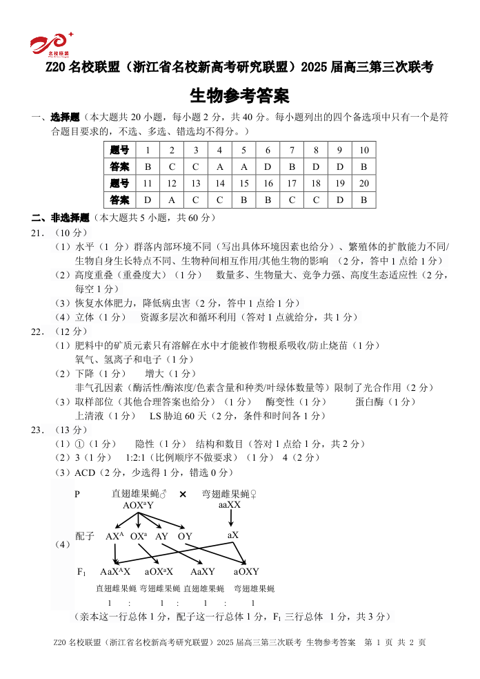 浙江省Z20联盟2025届高三第三次联考生物答案