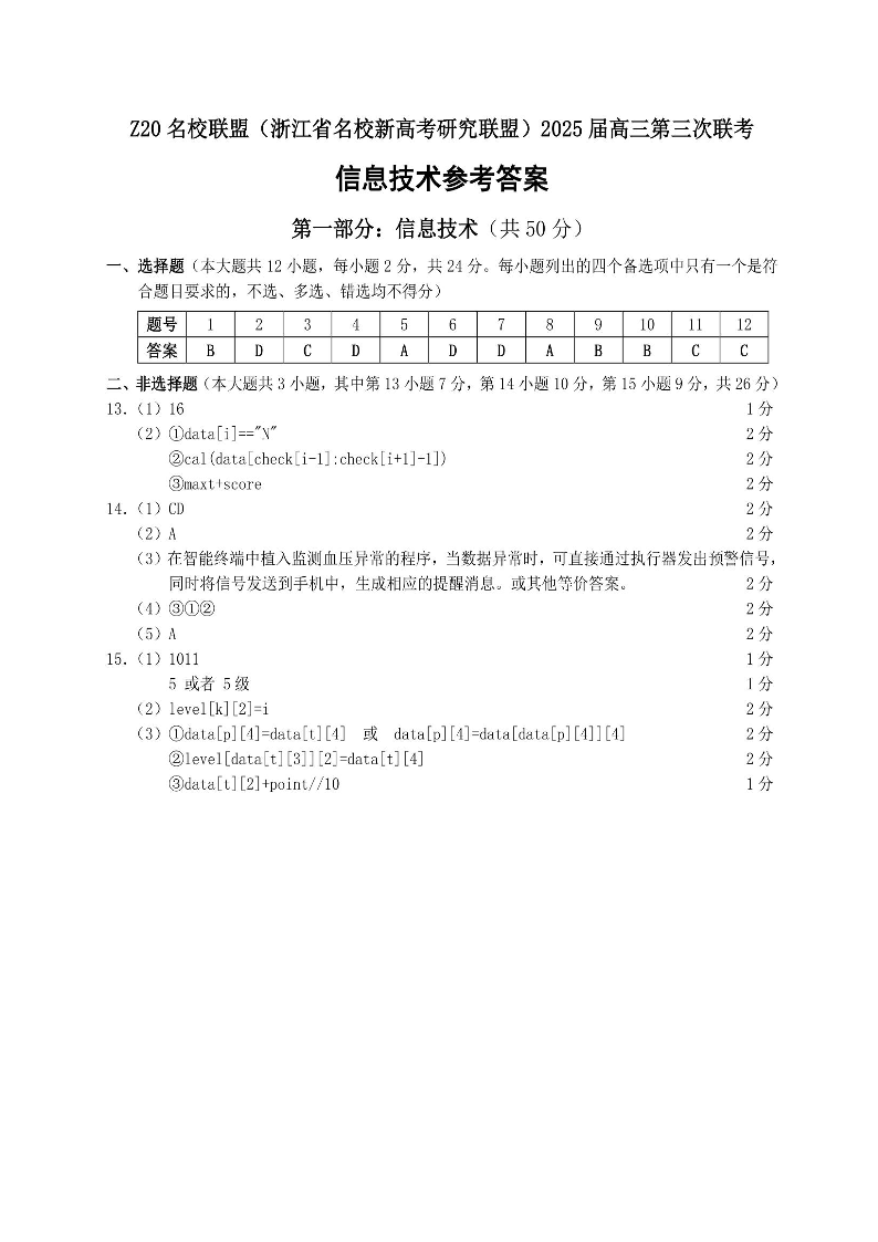 浙江省Z20联盟2025届高三第三次联考技术答案