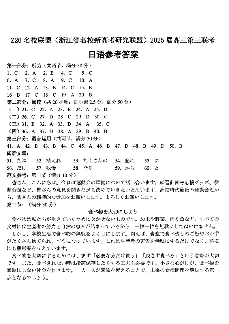 浙江省Z20联盟2025届高三第三次联考日语答案
