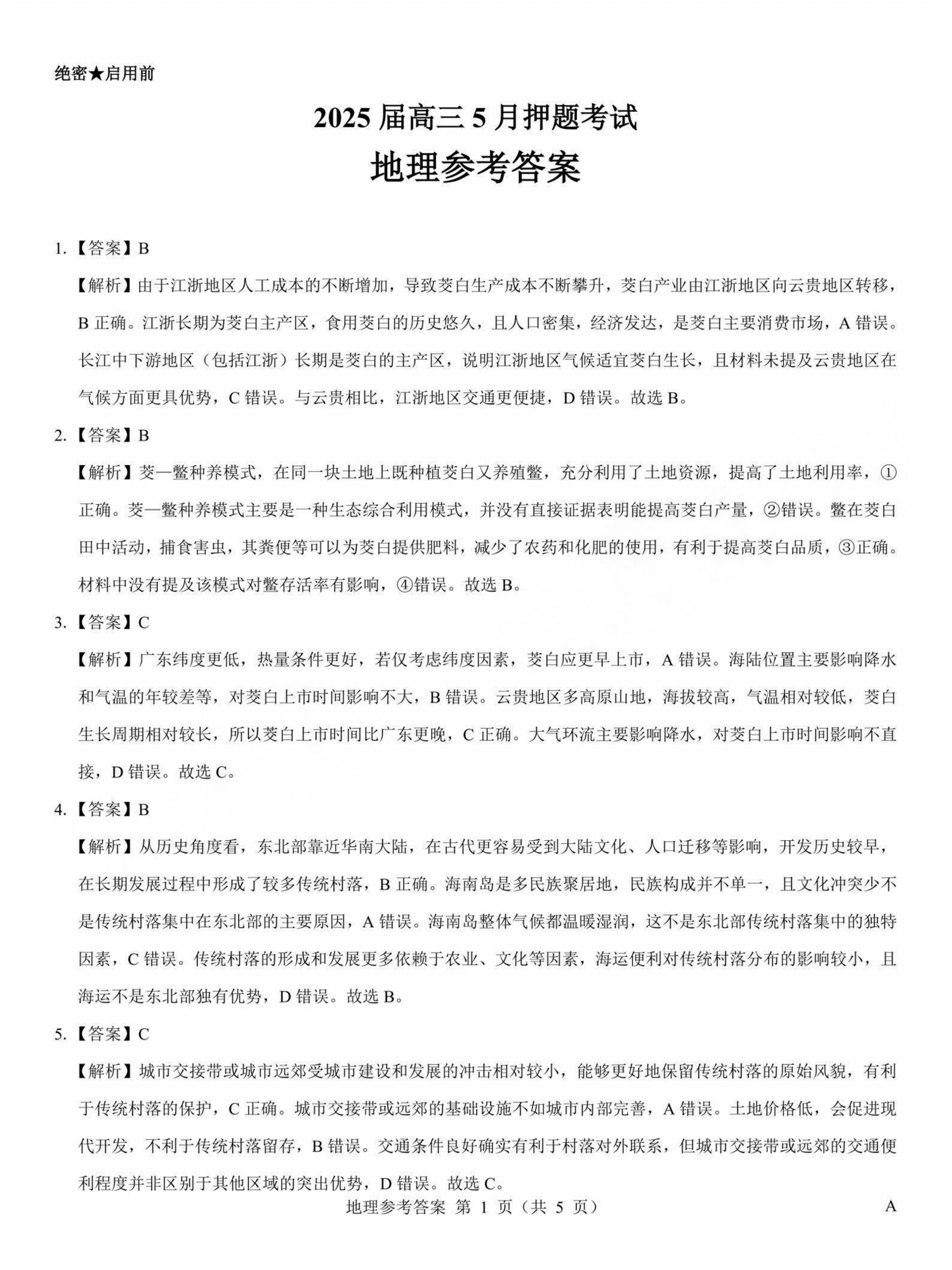 山西省太原市2025届高三5月押题考试(三模)地理答案