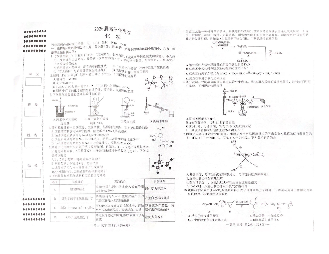江西省南昌市2025届高三信息卷(三模)化学
