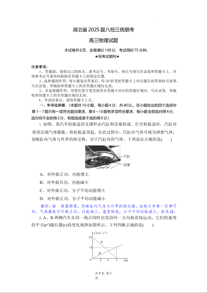 湖北省2025届高三5月八校三统联考物理(精品解析版)