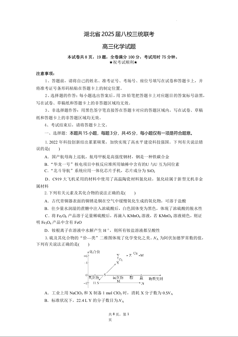 湖北省2025届高三5月八校三统联考化学(原卷版)