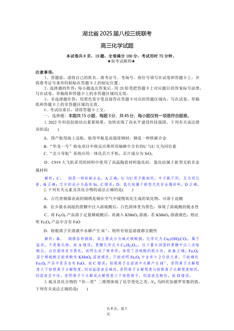 湖北省2025届高三5月八校三统联考化学(精品解析版)