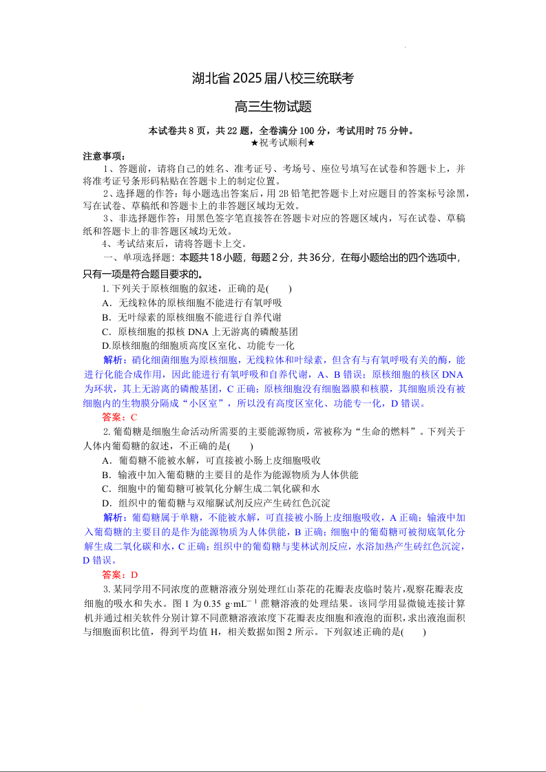 湖北省2025届高三5月八校三统联考生物(精品解析版)
