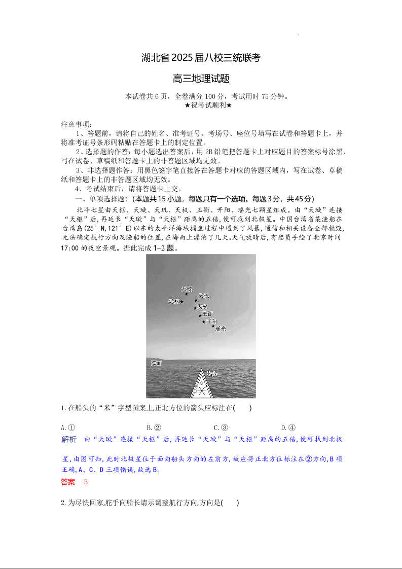 湖北省2025届高三5月八校三统联考地理(精品解析版)