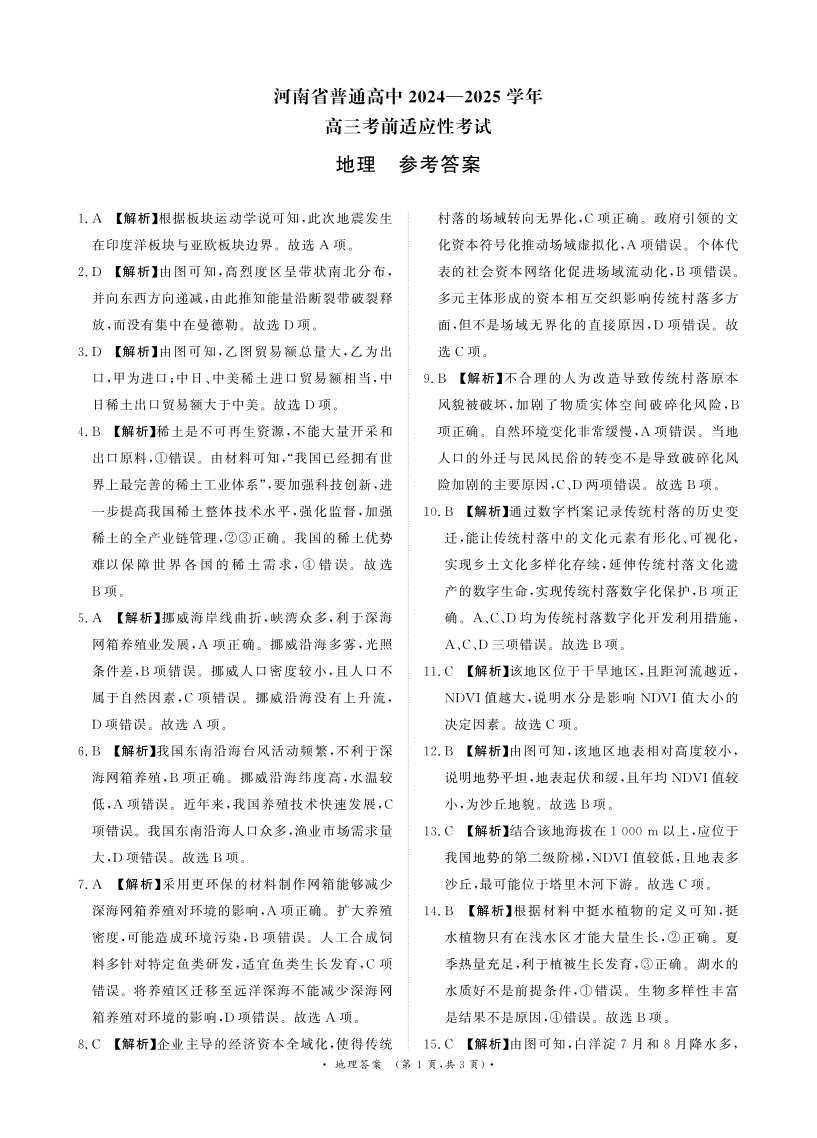 河南省区域高中2025届高三5月大联考考前适应性考试地理答案
