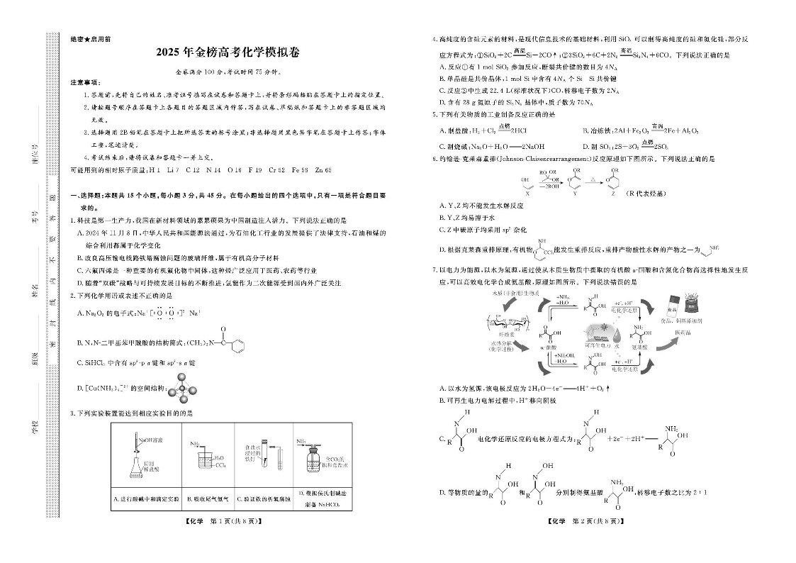 辽宁省名校联盟2025届高三下学期高考考前模拟押题卷化学+答案