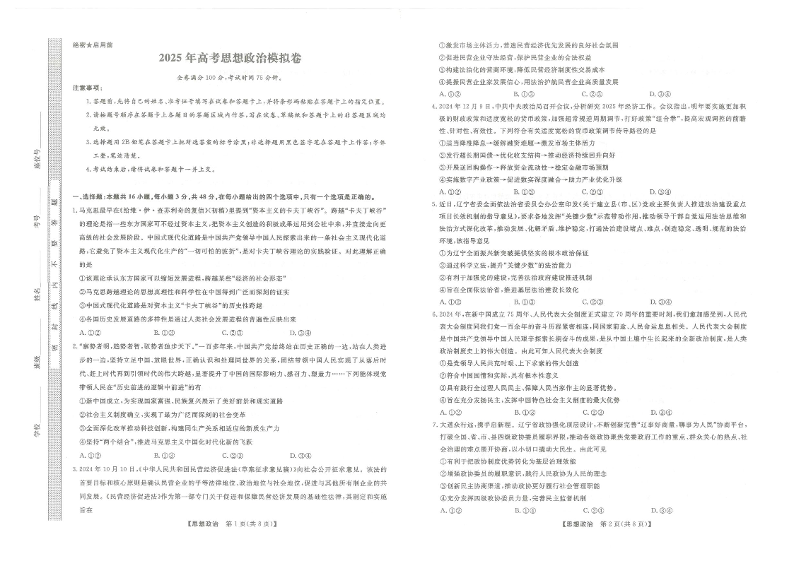 辽宁省名校联盟2025届高三下学期高考考前模拟押题卷政治+答案