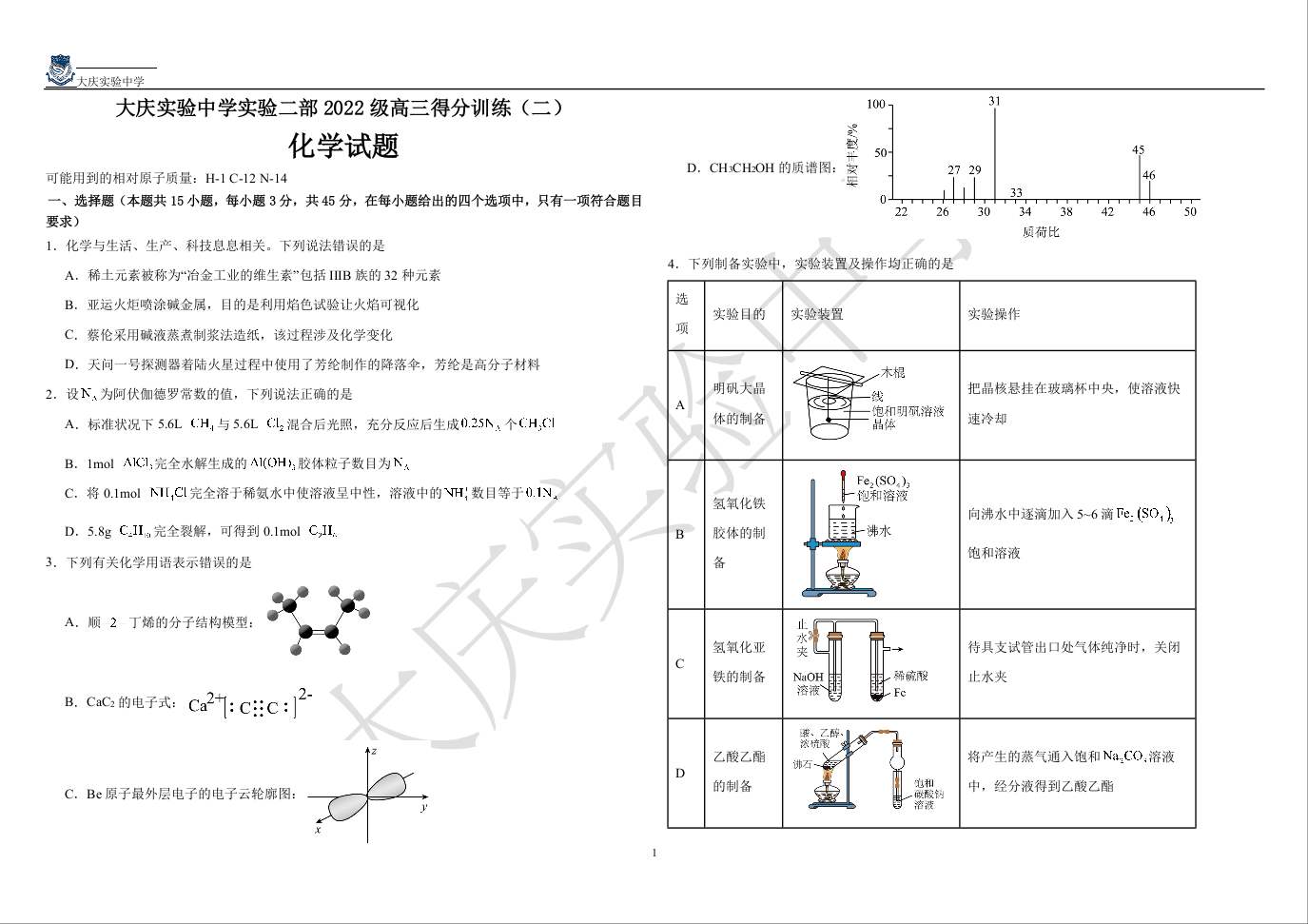 黑龙江省大庆实验中学二部2025届高三得分训练(二)化学