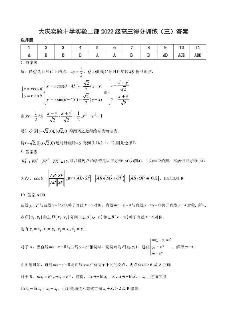 黑龙江省大庆实验中学二部2025届高三得分训练(三)数学答案