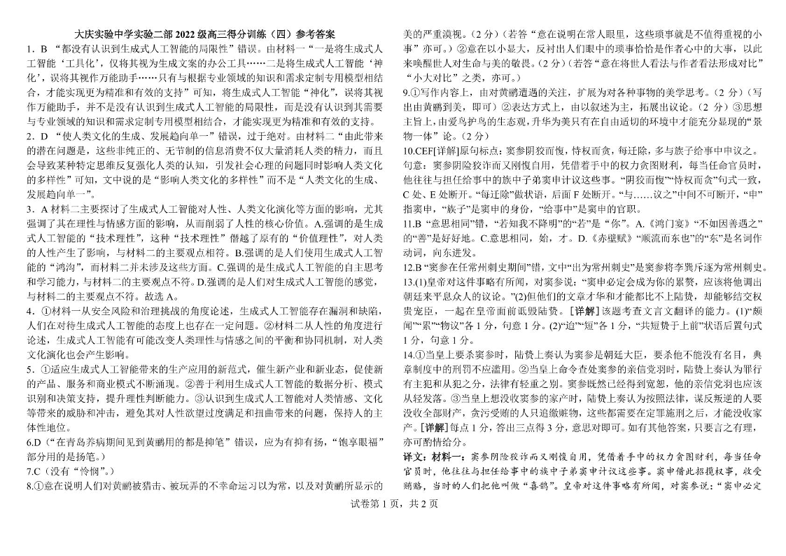 黑龙江省大庆实验中学二部2025届高三得分训练(四)语文答案