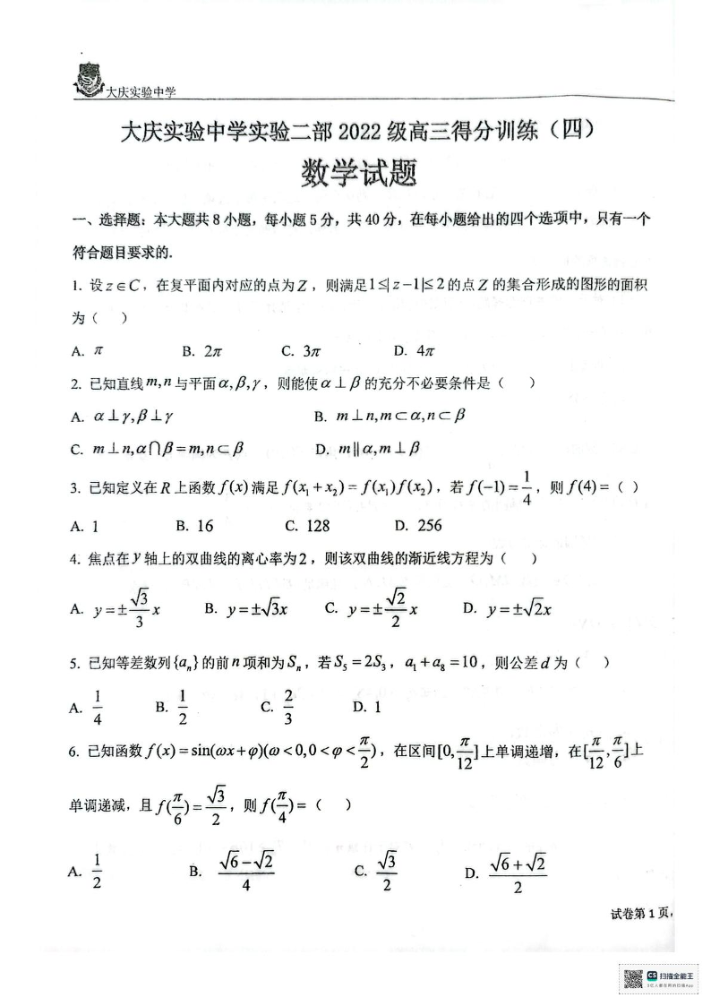 黑龙江省大庆实验中学二部2025届高三得分训练(四)数学