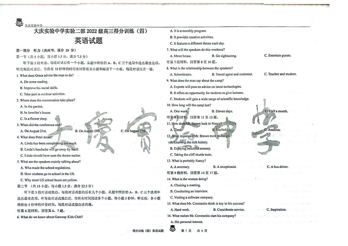 黑龙江省大庆实验中学二部2025届高三得分训练(四)英语