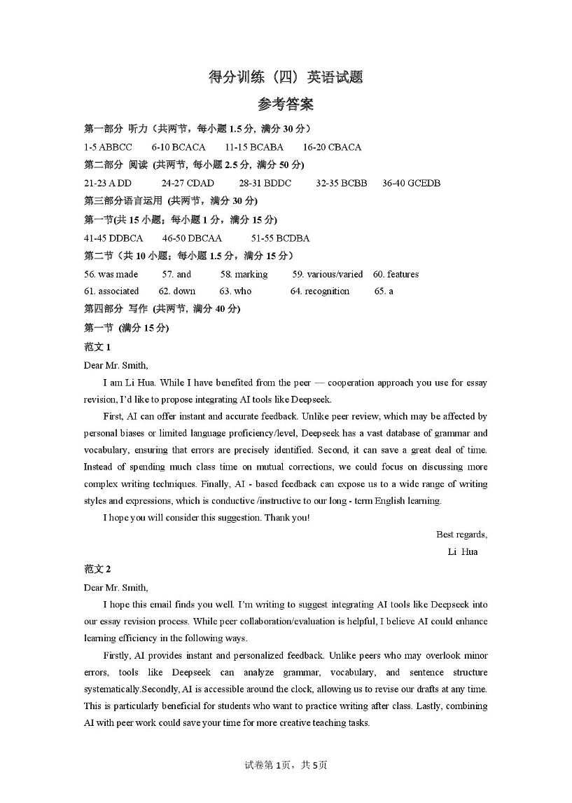 黑龙江省大庆实验中学二部2025届高三得分训练(四)英语答案
