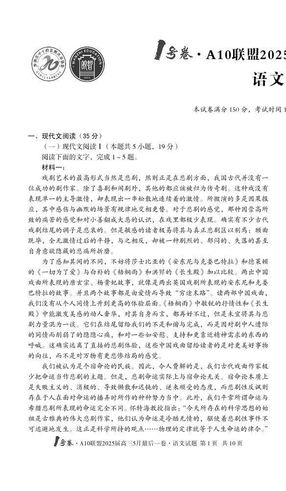 安徽省1号卷·A10联盟2025届高三5月最后一卷语文