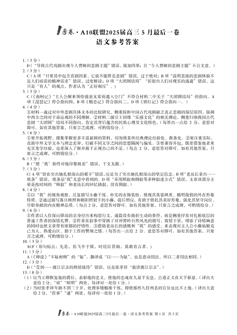 安徽省1号卷·A10联盟2025届高三5月最后一卷语文答案