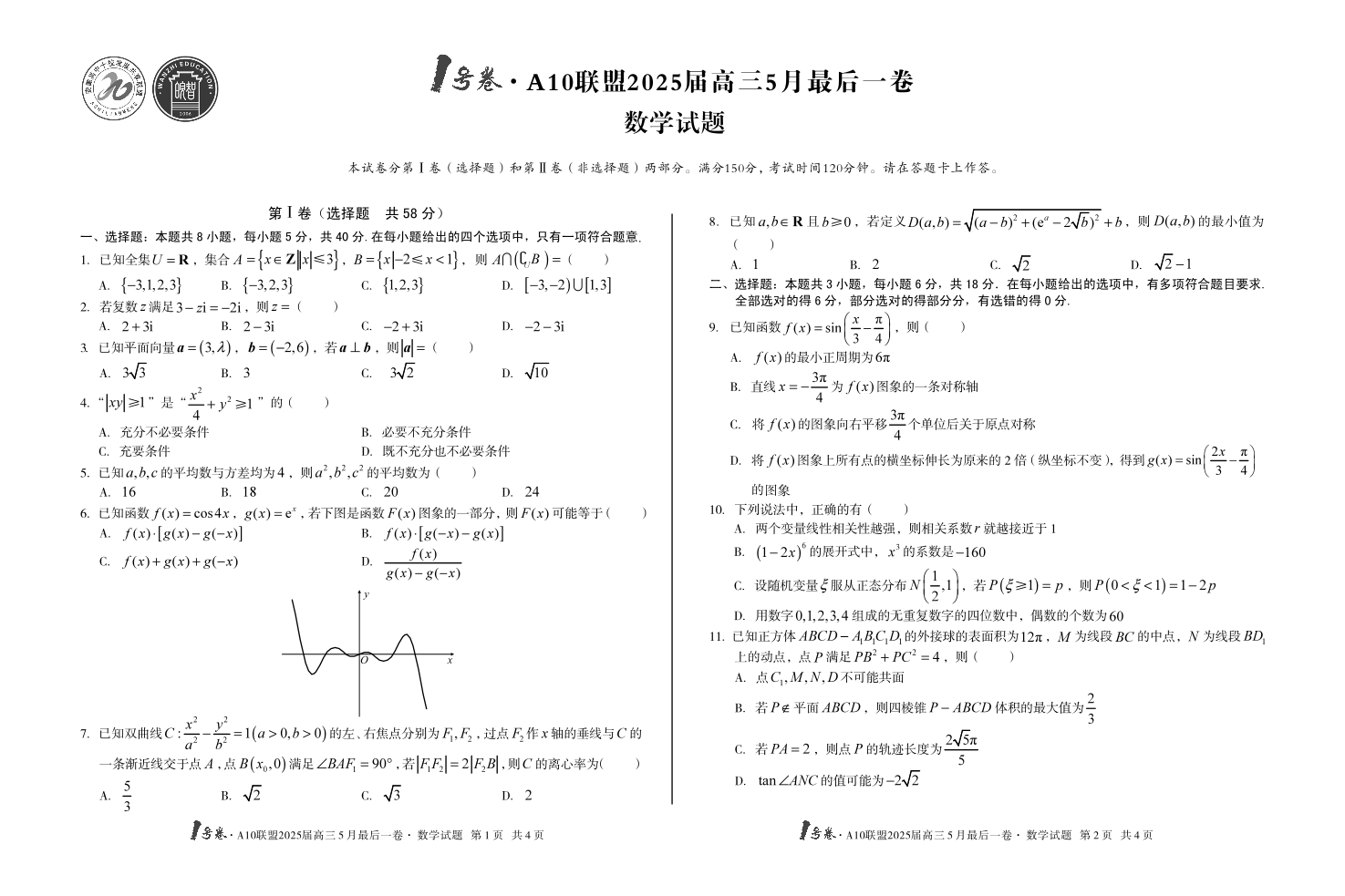 安徽省1号卷·A10联盟2025届高三5月最后一卷数学